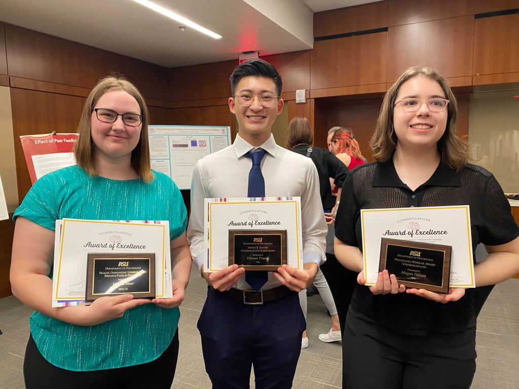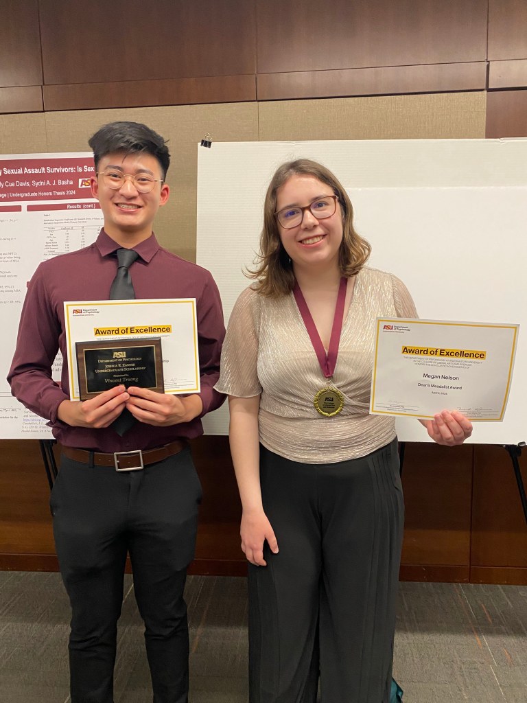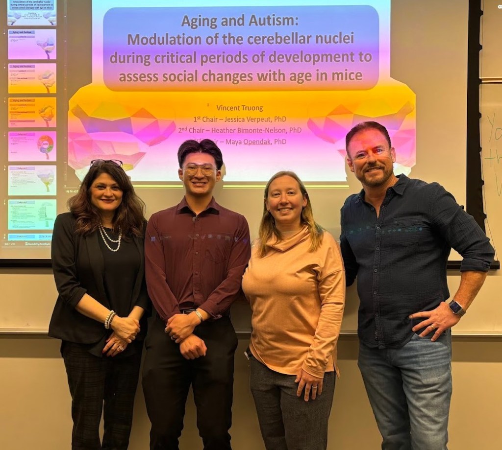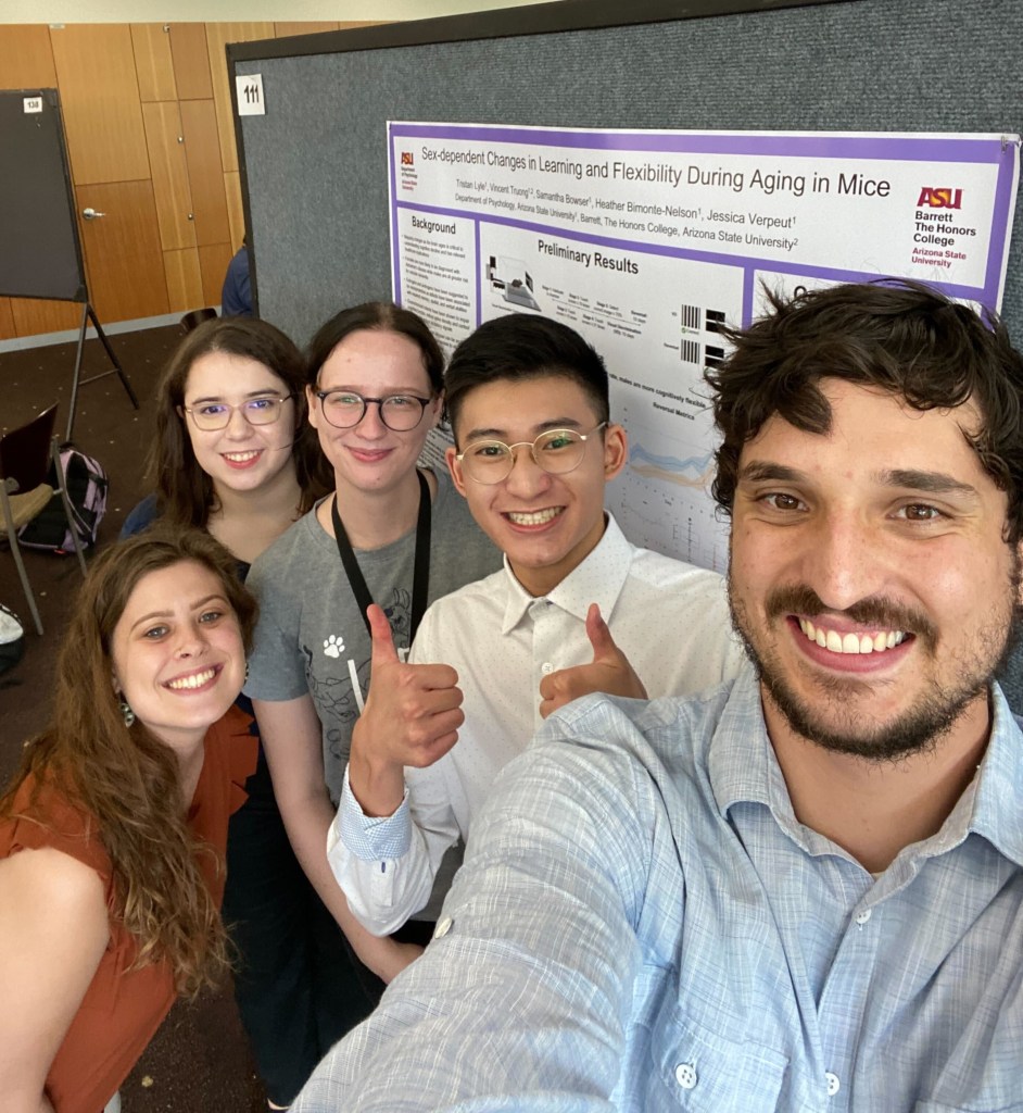Our graduating seniors, Megan Nelson and Jaime Farrington, successfully defended their honor thesis! We had a number of presentations, including AZPURC (bottom left: Kendall Christiansen, Vincent Truong, Dr. Verpeut, Henrique Vieira, and Megan Nelson). Vincent and Megan also received a number of awards! Megan received the Dean’s Medal for the Department of Psychology!!