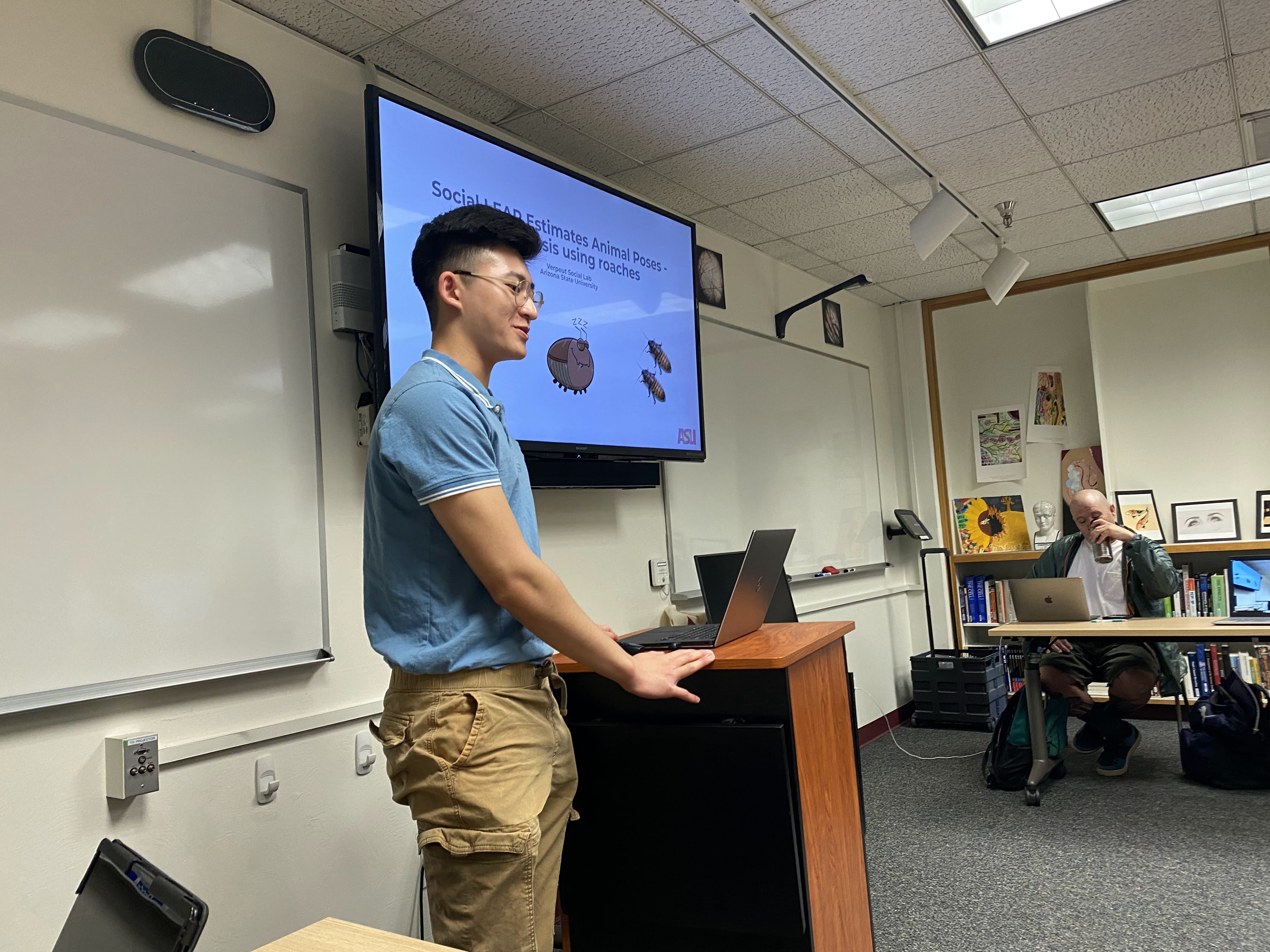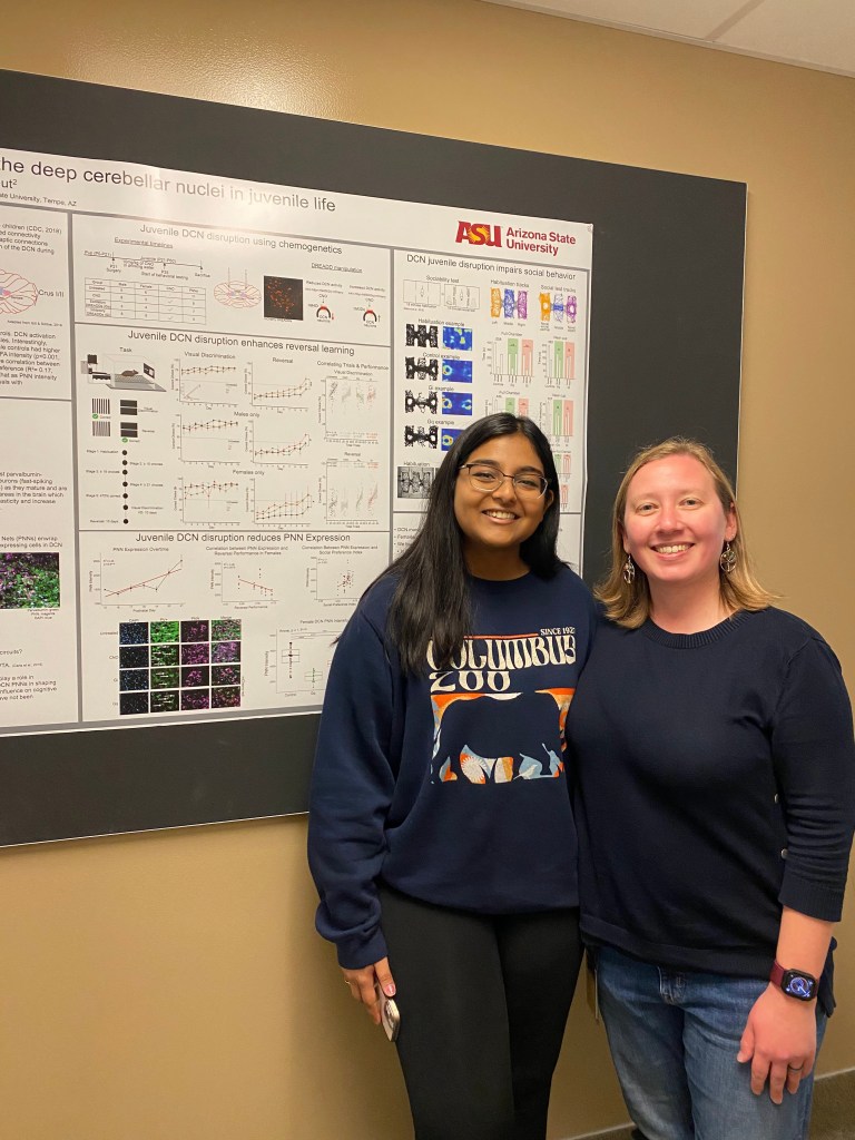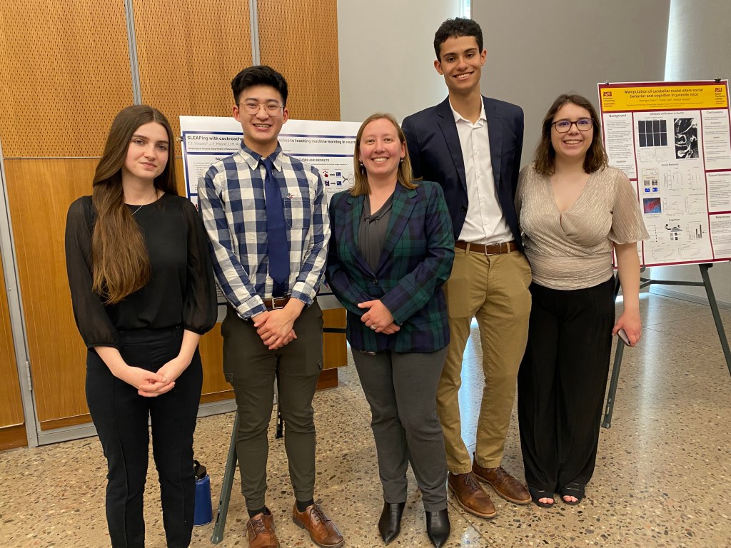 The spring semester was very exciting for the lab. We had our second machine learning workshop with Dr. Ricoy and students at the University of Arizona (top left and bottom left showcasing Vincent Truong). Dr. Verpeut presented a workshop for machine learning to study cerebellar behaviors at Winter Brain (top right). Graduate students (Tristan Lyle and Olivia Law) presented at the Neuroscience recruitment seminar for ASU (right middle). The lab also participated in ASU Open Door for the first time (bottom middle and right with Alexandria Melick and David Lukacik pictured)!